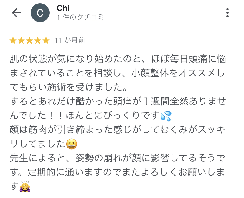 美容整体P 【体験談】顔のむくみ・頭痛・腰痛・姿勢の歪み 2023.09.29 Share RSS 31歳 女性 介護職 お悩み:顔のむくみ、頭痛、腰痛、姿勢の歪み 施術内容:顔整体プロコース・オーダーメイド整体 Q.PLUS beautyのどんなところを気に入っていただけましたか? 院内の落ち着いた感じが気に入っています。完全予約制で待ち時間もないので助かります。 施術も体全体を見ながら施術してくださるのでとてもありがたいです。力加減もちょうどいいのでとてもリラックスできます♪ グーグルマイビジネスへの口コミ 野間稜大 京都市北区と上京区の境にあるしゅん太鍼灸整骨院・整体院の副院長の野間です(^ ^) Share RSS 投稿者: 野間稜大 しみ・しわ・たるみ, 不調改善, 女性の不調, 美容整体P, 美容鍼, 鍼灸整体 体験談, 小顔, 整体 【体験談】産後の自律神経の乱れ・頭痛・体の不調 前の記事 【体験談】顔のむくみ・肩こり・腰痛・体の歪み 次の記事