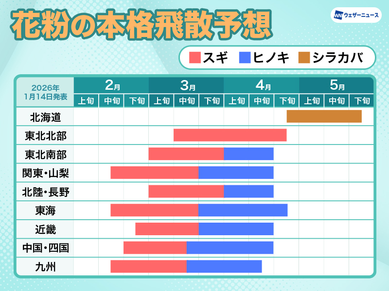 天気情報では2月中旬からスギ花粉がピークを迎え、ヒノキ花粉は3月中旬〜4月中旬でピークを迎えるとのこと。