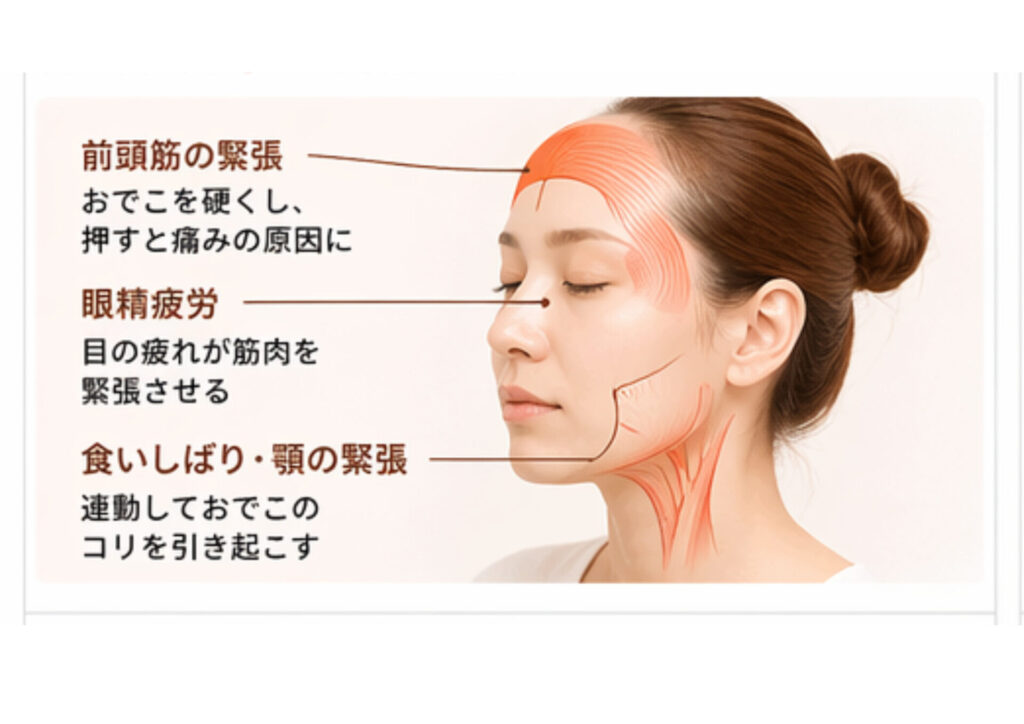 おでこの凝りは、単なる疲れではなく眼精疲労・食いしばり・姿勢の崩れなどが重なって起きているケースが多いです。